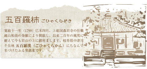 寛政十一年(1799)巳末四月、上総国森岩寺の住職越山和尚の発願により開眼し、以来二百年の風雪に耐えて今も岩山の上に鎮座まします岐阜県中津川千旦林『五百羅漢(ごひゃくらかん)』にちなんで名づけたふる里銘菓です。